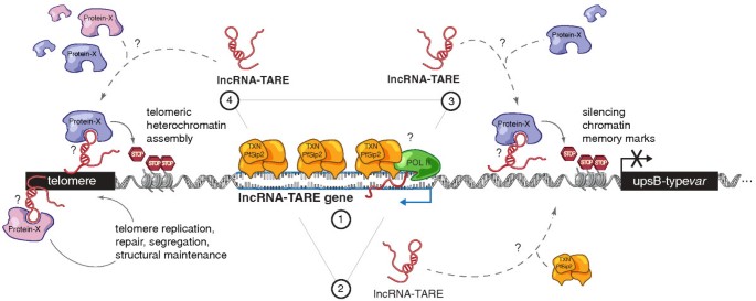 本研究首次发现恶性疟原虫中的22个端粒相关长链非编码RNA,它们在DNA复制后协同表达,推测其参与端粒维持、upsB型var基因调控及染色质重塑过程。创新性在于首次系统鉴定恶性疟原虫长链非编码RNA,并发现了一类全新的端粒相关非编码RNA家族,为疟原虫转录调控机制研究提供了新的视角。统计学结果显示,lncRNA-TARE-4L的跨物种保守性具有统计学意义(P=0.045),定量实时聚合酶链反应的表达差异在生物学重复中具有一致性(n=2,P<0.05,文献未明确具体P值)。作者进一步提出四种功能模型:PfSip2与lncRNA-TARE的相互调控、lncRNA-TARE招募PfSip2到染色体端、lncRNA-TARE参与var基因的表观沉默、lncRNA-TARE参与端粒异染色质组装,为后续功能验证研究提供了方向。