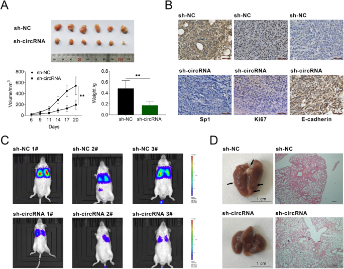 方法细节:构建裸鼠皮下移植瘤模型,将稳定转染sh-circ_0005529或sh-NC的MKN-45细胞(携带荧光素酶标记)分别皮下接种于BALB/c裸鼠,每3天监测肿瘤体积,接种21天后处死小鼠并取出肿瘤,称重并采用免疫组化(IHC)检测肿瘤组织中Sp1、Ki67、E-cadherin的表达;构建裸鼠肺转移模型,将稳定转染sh-circ_0005529或sh-NC的MKN-45细胞尾静脉注射于裸鼠,接种30天后采用活体成像系统检测肺转移灶,处死小鼠后取出肺组织,采用H&E染色分析病理变化。
