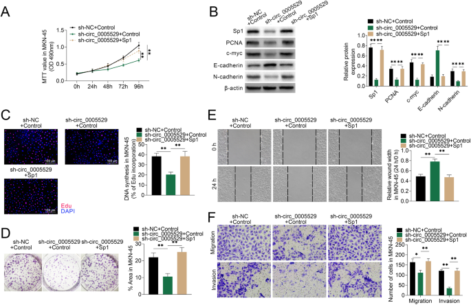 方法细节:构建过表达Sp1的质粒并转染MKN-45细胞,采用Western blotting验证转染效率;在MKN-45细胞中同时敲低circ_0005529并过表达Sp1,采用MTT法、EdU掺入实验、克隆形成实验检测细胞增殖能力,采用划痕愈合实验、Transwell迁移侵袭实验检测细胞迁移侵袭能力;采用Western blotting检测增殖相关蛋白(PCNA、c-myc)及上皮间质转化(EMT)相关蛋白(E-cadherin、N-cadherin)的表达变化。