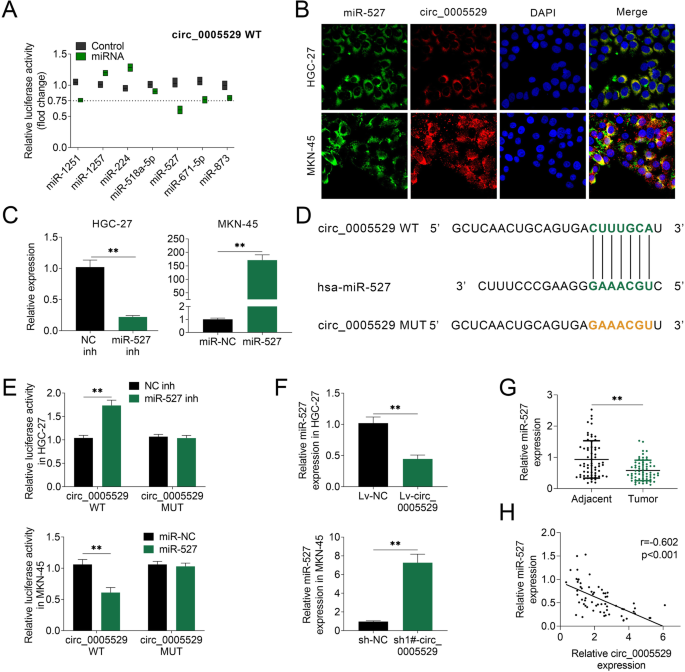 方法细节:采用starBase数据库预测circ_0005529的潜在靶miRNA;构建包含circ_0005529序列及突变结合位点的荧光素酶报告质粒,与miR-527模拟物或抑制剂共转染胃癌细胞,通过双荧光素酶报告实验验证靶向结合;采用FISH检测circ_0005529与miR-527在胃癌细胞中的亚细胞定位;采用RNA结合蛋白免疫沉淀(RIP)实验检测两者与Ago2的结合;采用qRT-PCR检测circ_0005529过表达/敲低后miR-527的表达变化;检测63对胃癌组织中miR-527的表达,并采用Pearson相关分析其与circ_0005529表达的相关性。