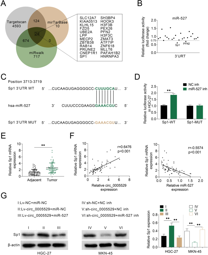 方法细节:采用Targetscan、mirTarBase、miRwalk数据库预测miR-527的潜在靶基因,取三个数据库的交集得到24个候选基因;构建包含候选基因3"UTR序列的荧光素酶报告质粒,与miR-527模拟物共转染MKN-45细胞,通过双荧光素酶报告实验筛选靶基因;构建包含Sp1 3"UTR序列及突变结合位点的荧光素酶报告质粒,验证miR-527与Sp1的靶向结合;采用qRT-PCR及蛋白质免疫印迹(Western blotting)检测miR-527过表达/敲低后Sp1的表达变化;检测63对胃癌组织中Sp1 mRNA的表达,采用Pearson相关分析其与circ_0005529、miR-527表达的相关性;通过rescue实验验证circ_0005529通过miR-527调控Sp1的表达。
