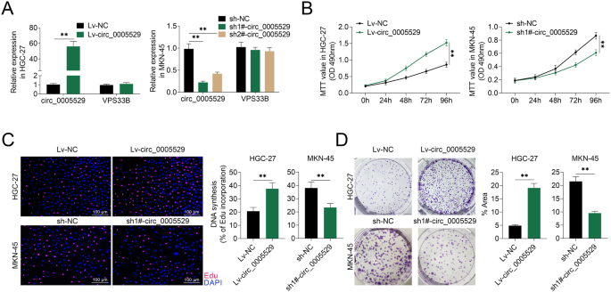 方法细节:构建过表达circ_0005529的慢病毒载体(Lv-circ_0005529)并感染HGC-27细胞,构建敲低circ_0005529的慢病毒载体(sh-circ_0005529)并感染MKN-45细胞,采用qRT-PCR验证转染效率;分别采用MTT法、EdU掺入实验、克隆形成实验检测细胞的增殖能力。
