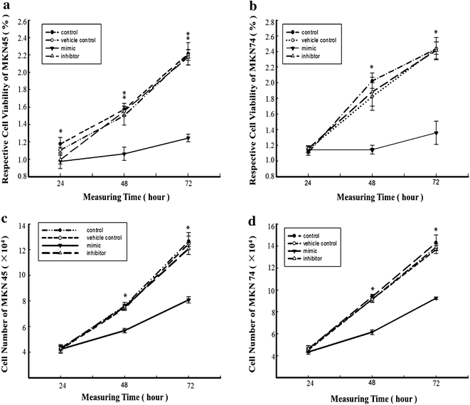 实验目的是验证miR-338-5p对GCSCs增殖能力的直接调控作用。方法细节:将miR-338-5p模拟物或抑制剂通过Lipofectamine 2000转染至MKN45和MKN74来源GCSCs,采用MTT法检测转染后24、48、72小时的细胞增殖情况,同时通过活细胞计数实验验证结果的可靠性。结果解读:转染miR-338-5p模拟物后,MKN45和MKN74来源GCSCs中miR-338-5p的表达水平分别上调19.71倍和28.29倍(n=3,P<0.01);MTT实验显示,转染72小时后MKN45来源GCSCs的增殖抑制率为43.89%±5.72(n=3,P<0.01),MKN74来源GCSCs的增殖抑制率为48.21%±4.91(n=3,P<0.05);活细胞计数结果显示,转染48小时后MKN45和MKN74来源GCSCs的细胞数量分别降至对照组的25.33%±2.14和34.51%±4.02(n=3,P<0.01、P<0.05),而miR-338-5p抑制剂对细胞增殖无显著影响(n=3,P>0.05)。