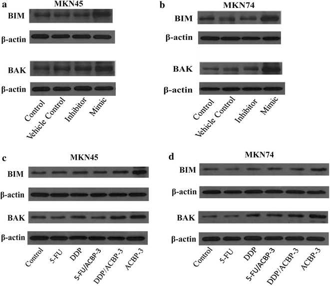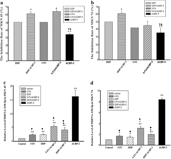 实验目的是验证ACBP-3联合化疗药物对GCSCs的协同抑制作用,并明确其与miR-338-5p的关联。方法细节:采用MTT法检测不同浓度顺铂(DDP)和5-氟尿嘧啶(5-FU)对GCSCs的增殖抑制率,确定半数抑制浓度(IC50);将GCSCs用0.5 IC50的DDP或5-FU联合22μg/ml ACBP-3处理48小时,检测细胞增殖抑制率;通过qRT-PCR检测miR-338-5p的表达水平,Western Blot检测BAK和BIM的蛋白表达。结果解读:DDP和5-FU对GCSCs的抑制作用呈剂量和时间依赖性;联合处理后,MKN45来源GCSCs的增殖抑制率显著高于单独化疗组(n=3,P<0.01),MKN74来源GCSCs的DDP联合组抑制率显著高于单独DDP组(n=3,P<0.01);qRT-PCR结果显示,联合处理后miR-338-5p的表达水平较单独化疗组显著上调(n=3,P<0.01),BAK和BIM的蛋白表达也同步升高,提示ACBP-3通过上调miR-338-5p增强化疗药物对GCSCs的抑制作用。