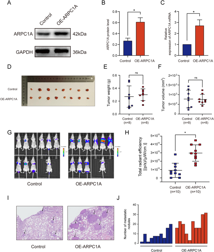实验目的:验证ARPC1A在体内对前列腺癌生长和转移的调控作用。方法细节:构建裸鼠皮下移植瘤模型,将ARPC1A过表达或对照PC-3细胞注射到裸鼠右侧背部皮下,每组8只,28天后处死小鼠,测量肿瘤的大小和重量;构建裸鼠肺转移模型,将ARPC1A过表达或对照PC-3细胞通过尾静脉注射到裸鼠体内,每组10只,28天后采用IVIS Lumina II活体成像系统检测肺转移的荧光信号,随后取肺组织进行HE染色,计数转移结节的数量。结果解读:皮下移植瘤模型中,ARPC1A过表达组与对照组的肿瘤大小和重量无显著差异(n=8,P>0.05);肺转移模型中,ARPC1A过表达组的肺转移荧光信号强度显著高于对照组,HE染色显示转移结节数显著增多(n=10,P<0.05),提示ARPC1A在体内促进前列腺癌的肺转移,但对肿瘤生长无明显影响。