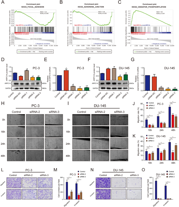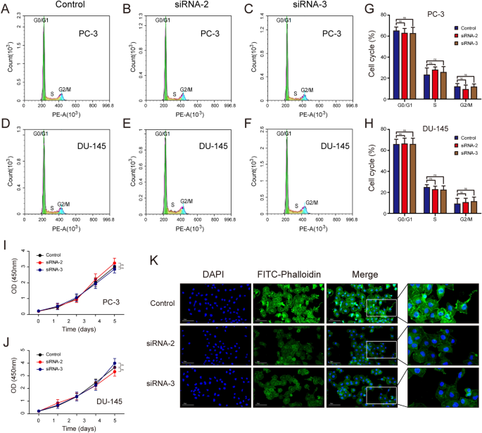 实验目的:明确ARPC1A在前列腺癌细胞迁移、侵袭、增殖、细胞周期及细胞骨架形成中的作用。方法细节:在PC-3和DU-145细胞中设计3条靶向ARPC1A的小干扰RNA(siRNA),通过qRT-PCR和WB验证敲低效率,筛选出2条高效siRNA(siRNA-2、siRNA-3)用于后续实验;采用划痕实验检测细胞迁移能力,Transwell实验(未包被Matrigel用于迁移,包被Matrigel用于侵袭)检测细胞迁移和侵袭能力;CCK-8实验检测细胞增殖活性;流式细胞术检测细胞周期分布;采用FITC标记的鬼笔环肽进行免疫荧光染色,观察细胞骨架的变化;同时构建ARPC1A过表达的PC-3稳定细胞系,通过慢病毒转染结合嘌呤霉素筛选获得阳性克隆,并用qRT-PCR和WB验证过表达效率。结果解读:敲低ARPC1A后,PC-3和DU-145细胞的划痕愈合率显著降低(n=3,P<0.05),Transwell迁移和侵袭实验中穿膜细胞数显著减少(n=3,P<0.05);CCK-8实验显示,敲低ARPC1A对细胞增殖活性无显著影响(n=3,P>0.05);流式细胞术检测显示,细胞周期分布无显著变化(n=3,P>0.05);免疫荧光染色显示,敲低ARPC1A后,细胞内肌动蛋白丝的数量减少,细胞骨架形成受抑制;ARPC1A过表达的PC-3细胞系构建成功,其mRNA和蛋白表达水平显著高于对照组(n=3,P<0.05)。