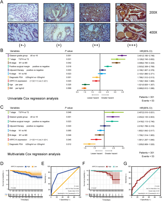研究过程详述:ARPC1A的检测样本包括前列腺癌组织、癌旁正常组织、前列腺癌细胞系及正常前列腺上皮细胞系,验证方法包括qRT-PCR、WB、免疫组化等;其特异性表现为在前列腺癌组织和细胞系中表达显著高于正常组织和细胞系(n=485/20/3,P<0.05),且与T分期、N分期等恶性临床特征相关;敏感性方面,其预测前列腺癌根治术后BCR的敏感性为77.4%,预测OS的敏感性为51.3%,ROC曲线AUC分别为0.775和0.704。