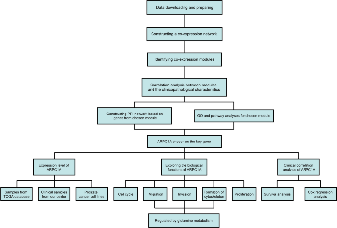 首先,作者总结了前列腺癌的临床现状,指出其异质性导致的预后差异是临床诊疗的关键难点,现有研究虽对发病机制有一定认知,但缺乏能有效区分惰性与侵袭性病变的生物标志物。其次,作者回顾了生物信息学技术在肿瘤生物标志物筛选中的应用,提到加权基因共表达网络分析(WGCNA)已成功用于前列腺癌的hub基因筛选,但针对ARPC1A的研究尚未见报道。再者,作者梳理了ARP2/3复合物在其他肿瘤中的功能,该复合物通过调控细胞骨架动态参与肿瘤细胞的迁移和侵袭,在膀胱癌、胶质瘤、胃癌等多种肿瘤中被证实与不良预后相关,但ARPC1A作为复合物的亚基,其在前列腺癌中的具体作用仍不明确。此外,作者提及谷氨酰胺代谢作为肿瘤代谢重编程的关键环节,调控多种肿瘤生物学过程,但谷氨酰胺代谢与ARPC1A的关联尚未被揭示。