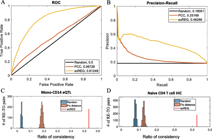 实验目的是构建准确的亚群特异性顺式调控网络,验证调控关系的可靠性;方法细节:计算每个亚群的顺式调控评分=W3×h,其中h为该亚群H矩阵的均值,筛选top10000个调控元件-靶基因对,将同一亚群的细胞合并后用MACS2软件进行峰calling,优化调控元件的位置;分别用表达数量性状位点数据和启动子捕获高通量染色体构象捕获数据验证调控关系;结果解读:用CD14阳性单核细胞的表达数量性状位点数据验证,scREG的受试者工作特征曲线下面积为0.81,精确召回曲线下面积为0.46(n=100000,P<0.001),远高于Pearson相关方法(受试者工作特征曲线下面积=0.56,精确召回曲线下面积=0.25);用高通量染色体构象捕获数据验证,scREG的预测精度是随机选择(匹配距离分布)的3倍;调控网络具有高度细胞类型特异性,相似细胞类型的Jaccard相似度更高,如4个T细胞亚群的平均相似度为0.7783(n=14,文献未明确提供P值,基于图表趋势推测);产品关联:文献未提及具体实验产品,领域常规使用峰calling软件、表达数量性状位点数据库、高通量染色体构象捕获数据库进行调控关系验证。