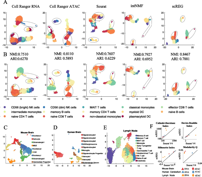 实验目的是基于低维表示准确识别细胞亚群,验证scREG方法的分群准确性;方法细节:基于H矩阵计算细胞间的余弦相似度,构建k近邻图并转换为加权图(权重为邻居的Jaccard相似度),采用Louvain算法进行细胞分群,使用轮廓指数、归一化互信息、调整兰德指数评估分群性能;结果解读:在人外周血单个核细胞数据中,scREG的轮廓指数在83.39%的细胞中高于单独主成分分析(RNA)和潜在语义分析(ATAC),在14种细胞类型中的9种表现最优,平均轮廓指数为0.5614(n=9543,文献未明确提供P值,基于图表趋势推测);与Seurat、scAI、MOFA+等方法相比,scREG的归一化互信息和调整兰德指数最高,且在分辨率0.2-2.0范围内表现稳定;在其他数据集(人小脑、小鼠E18脑、B细胞淋巴瘤淋巴结、骨髓单个核细胞)中,scREG的分群准确性均优于对比方法;产品关联:文献未提及具体实验产品,领域常规使用细胞分群分析R包、Louvain算法工具进行细胞分群与评估。