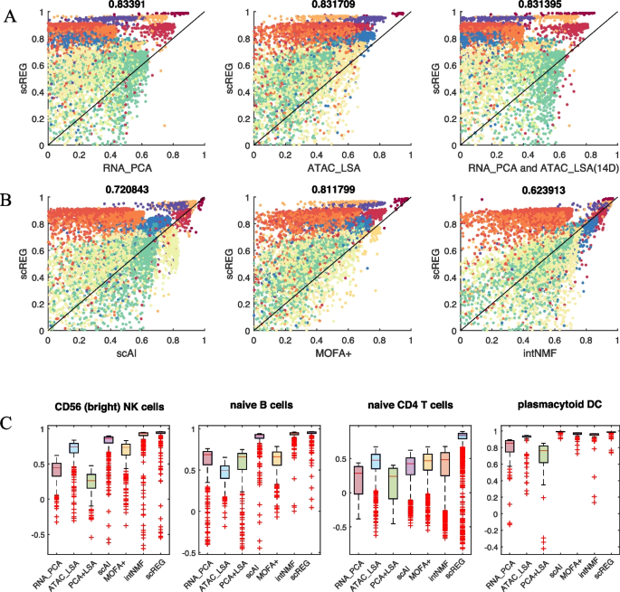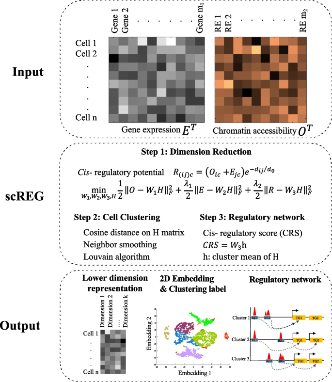 实验目的是将基因表达、染色质可及性与顺式调控潜能三种矩阵投影到共同的低维空间,实现多组学数据的深度整合;方法细节:构建非负矩阵分解优化模型,将基因表达矩阵分解为W2×H,染色质可及性矩阵分解为W1×H,顺式调控潜能矩阵分解为W3×H,其中W3的元素由W1、W2及基因组距离函数约束,通过迭代求解优化问题得到细胞的低维表示H矩阵(默认维度为100);结果解读:得到的H矩阵同时整合了三种数据的信息,相比单独对基因表达进行主成分分析或对染色质可及性进行潜在语义分析,能更准确区分细胞亚群;产品关联:文献未提及具体实验产品,领域常规使用R语言的非负矩阵分解分析包进行矩阵分解分析。