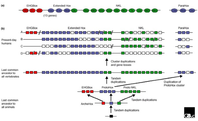 实验目的是基于共线性数据与概率模型,构建同源框基因簇从脊椎动物祖先到现存物种的完整演化路径。方法细节整合基因串联重复、全染色体复制、基因丢失及染色体重排的现有研究数据,结合Hox基因簇的已知演化历程,提出包含多阶段事件的演化场景。结果解读:研究提出,脊椎动物祖先的单一染色体上存在包含EHGBox、Extended Hox、NKL三大类同源框基因的大型连锁簇(至少包含30个基因),而ParaHox基因簇虽同时存在但未与上述簇连锁;后续脊椎动物支系发生全染色体复制,伴随部分基因丢失,随机染色体重排逐渐打破大型连锁簇,形成现存人类、小鼠等物种中同源框基因的分散分布模式。该演化场景通过图1直观展示,清晰呈现了基因簇从整合到分散的过程。
