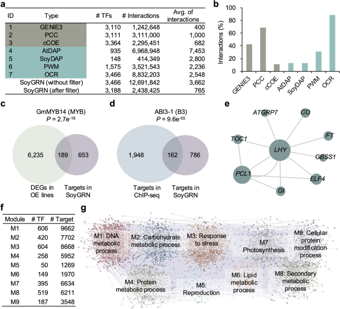 实验目的是整合多组学数据构建高置信度的大豆TF-靶标互作网络,并验证其可靠性。研究整合了7个独立的调控网络:DAP-seq直接鉴定的TF-靶标互作(SoyDAP)、基因共表达网络(GENIE3、PCC)、进化保守调控网络(cCOE)、拟南芥DAP-seq同源映射(AtDAP)、基序扫描(PWM)、染色质可及性辅助的互作(OCR),通过严格过滤得到高置信度互作关系;同时利用已发表的GmMYB14过表达RNA-seq数据、ABI3-1的ChIP-seq数据验证网络准确性,并对网络进行模块化功能分析。结果显示,构建的SoyGRN包含244万条TF-靶标互作关系,涉及3188个TF和51665个靶基因,覆盖91%的大豆TF;GmMYB14的预测靶基因与过表达株系的差异表达基因显著重叠(超几何检验,P=2.7e-16),ABI3-1的预测靶基因与ChIP-seq鉴定的靶基因显著重叠(超几何检验,P=9.6e-55),证明网络准确性高;网络被划分为9个功能模块,每个模块富集特定的生物学过程,如M4模块富集蛋白质代谢过程,M7模块富集光合作用过程。