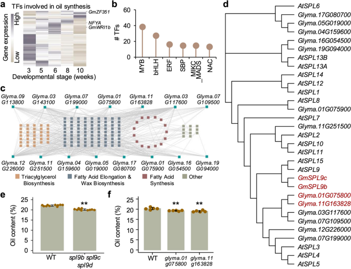 实验目的是利用SoyGRN挖掘调控大豆种子含油量的关键TF,并验证其功能。研究收集了723个参与油脂积累的基因(包括脂肪酸合成、三酰甘油合成等通路),筛选与这些基因互作的TF;分析候选TF在种子发育不同阶段的表达模式;利用已构建的大豆突变体库筛选含油量变化的TF突变体,对SBP家族TF进行CRISPR/Cas9敲除验证。结果显示,共筛选到279个调控含油量的候选TF,包括已知的GmWRI1b、GmZF351等;SBP家族TF调控21.4%的脂肪酸延长基因和24.1%的三酰甘油合成基因;spl9b spl9c spl9d突变体的种子含油量显著低于野生型(Student’s t-test,P=5.4e-10,n=10),Glyma.01G075800和Glyma.11G163828敲除突变体的含油量也显著降低(Student’s t-test,P<0.01,n=5),证明SBP家族TF是调控大豆种子含油量的关键因子。