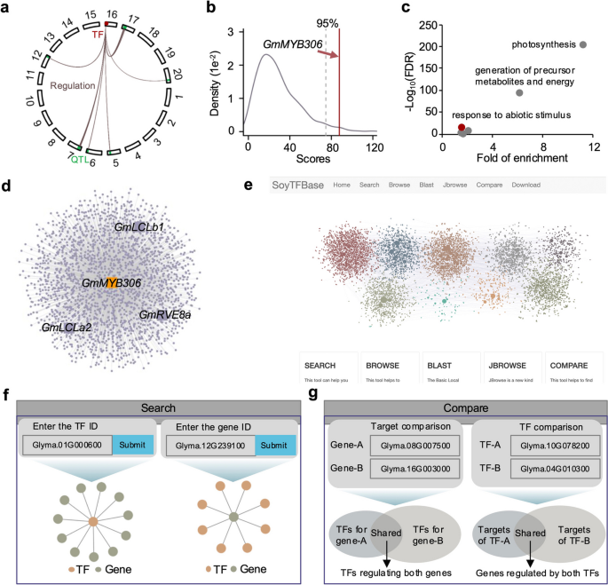 实验目的是利用SoyGRN优先定位QTL中的候选TF,以干旱敏感性指数QTL为例进行验证。研究对每个QTL内的TF,计算其与其他QTL内靶基因的互作得分总和,与1000个随机选择的TF对比,筛选得分前5%的TF;对候选TF进行GO功能富集分析,验证其与性状的相关性;同时开发了在线平台SoyTFBase,供研究者查询TF-靶标互作关系。结果显示,在干旱敏感性指数QTL中,GmMYB306被鉴定为高置信度候选TF,其靶基因显著富集“响应非生物刺激”过程,且包含多个已知的干旱响应基因(如GmRVE8a),证明SoyGRN可有效突破连锁不平衡的限制,精准定位QTL中的关键调控TF;在线平台SoyTFBase支持TF靶基因查询、基因调控TF查询及多TF/基因的互作对比功能。