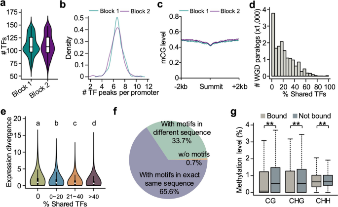 实验目的是探究WGD旁系同源基因的TF结合差异对其表达分化的影响。研究在大豆基因组中鉴定了16,634对WGD旁系同源基因,分析其启动子区TF结合的重叠比例,对比TF结合差异与表达分化的相关性,并解析TF结合差异的分子机制。结果显示,89.6%的WGD旁系同源基因启动子区结合的TF重叠比例<50%,且TF结合差异与表达分化呈正相关(Wilcoxon秩和检验,P<0.01);99.3%的旁系同源基因具有相同的TF结合基序,但结合TF的位点甲基化水平显著低于未结合的位点(Wilcoxon配对秩和检验,P<0.01),说明DNA甲基化差异是导致WGD旁系同源基因TF结合差异的重要原因。