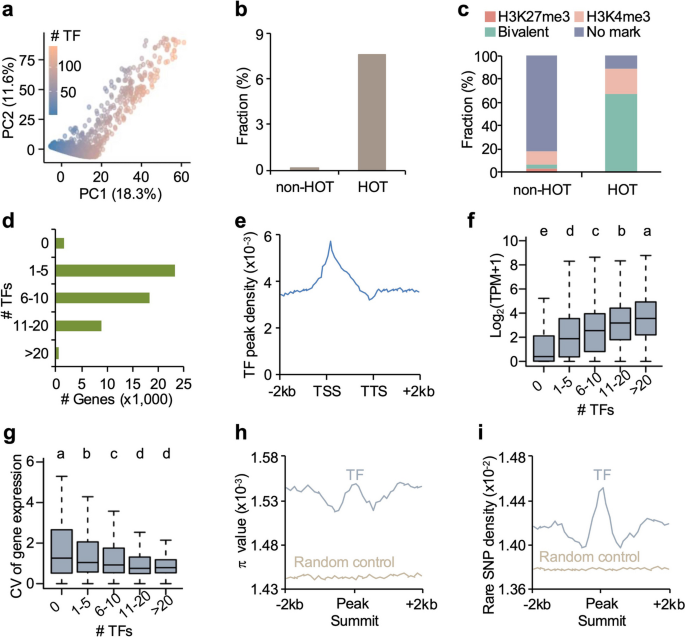 实验目的是解析TF结合位点在基因组中的分布规律及与基因表达、表观修饰、遗传变异的关系。研究将所有TF的结合峰合并为2kb非重叠窗口进行主成分分析,分析TF结合位点在基因区域的分布、与染色质可及性(ATAC-seq)、DNA甲基化(MethylC-seq)的关系,并基于302份大豆重测序数据分析TF结合位点的遗传变异特征。结果显示,TF结合位点并非随机分布,而是富集于染色质开放区域(OCRs),形成TF结合热点区域(HOT区域,结合≥74个TF),这些区域富含二价组蛋白标记(H3K4me3和H3K27me3);启动子区结合TF数量越多的基因,表达水平越高(转录本每百万读数,TPM值更高),组织特异性越低(表达变异系数CV更小);TF结合位点的核苷酸多样性显著高于侧翼区域,且稀有SNP密度更高,说明TF结合位点是大豆基因组的遗传变异热点。