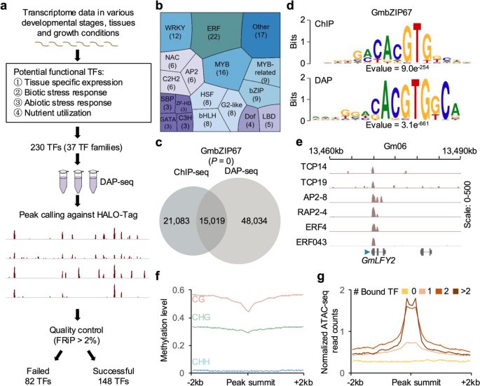 实验目的是获取大豆TF的全基因组结合位点,验证DAP-seq数据的可靠性。研究克隆了230个参与发育、胁迫响应、养分利用的大豆TF,通过DAP-seq技术绘制全基因组结合图谱,以峰中读数比例(FRiP)>2%为标准筛选得到148个TF(来自28个家族);对11个随机选择的TF进行生物学重复实验,验证数据重复性;同时将GmbZIP67的DAP-seq数据与已发表的ChIP-seq数据对比,验证技术可靠性。结果显示,共鉴定3,041,762个TF结合峰,每个TF的结合峰中位数为5737个;9个TF的生物学重复样本Pearson相关系数>0.9,不可复现发现率(IDR)<0.05,证明数据重复性高;GmbZIP67的DAP-seq与ChIP-seq峰重叠显著(超几何检验,P=0),且结合基序高度相似,进一步验证了DAP-seq数据的可靠性。