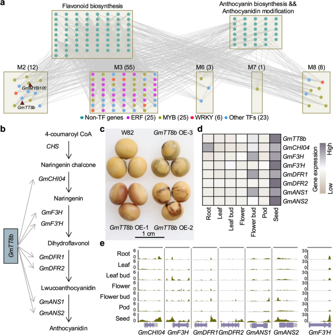 实验目的是利用SoyGRN挖掘调控大豆种皮颜色的关键TF,并验证其功能。研究收集了3179个参与类黄酮和花青素生物合成的基因,通过超几何检验筛选与这些基因互作的TF;对候选TF进行系统发育分析,选择与拟南芥TT8同源的GmTT8b进行过表达功能验证;同时分析GmTT8b及其靶基因的组织表达模式和染色质可及性。结果显示,共筛选到79个调控种皮颜色的候选TF,其中25个属于MYB家族;GmTT8b过表达株系的种子种皮颜色显著加深,且GmTT8b及其7个靶基因在种子中优先表达,其靶基因启动子区在种子中的染色质可及性更高,证明GmTT8b是调控大豆种皮颜色的关键TF。