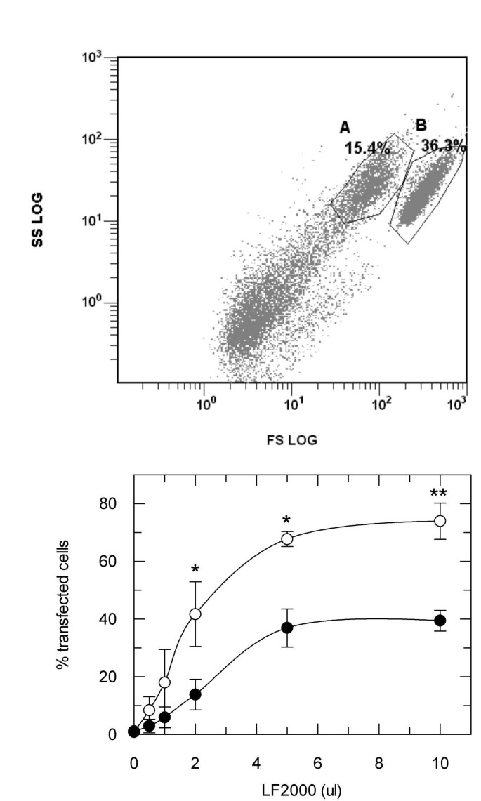 实验目的是明确胰岛素受体激活的剂量依赖性,并探索低剂量转染条件下的效率与信号干扰平衡。方法细节:在CHO.hIR细胞中加入不同体积的LF2000(0.5μl至10μl)处理4小时,通过免疫印迹检测胰岛素受体磷酸化水平;同时用绿色荧光蛋白(GFP)质粒作为报告基因,评估不同剂量LF2000的转染效率,通过流式细胞术分析GFP阳性细胞比例。结果解读:
