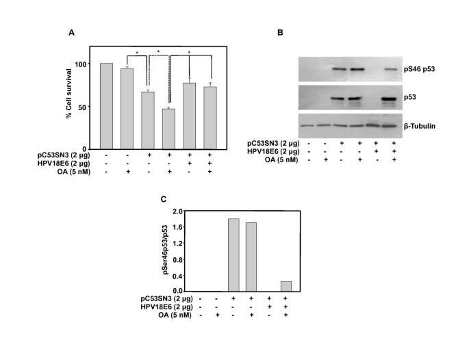 该Biomarker的来源为细胞系总蛋白样本,验证方法为Western blot检测Ser46磷酸化p53的表达水平;特异性方面,Ser46磷酸化是p53激活并发挥抑癌功能的关键修饰,仅在功能激活的p53中存在;敏感性数据显示,OA处理后Ser46磷酸化p53水平显著升高(文献未明确具体数值,基于图表趋势推测),E6处理后该水平显著降低(文献未明确具体数值,基于图表趋势推测)。