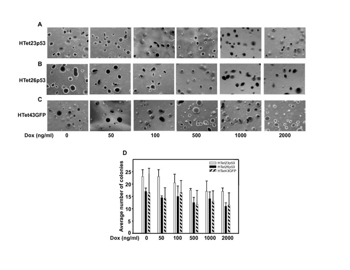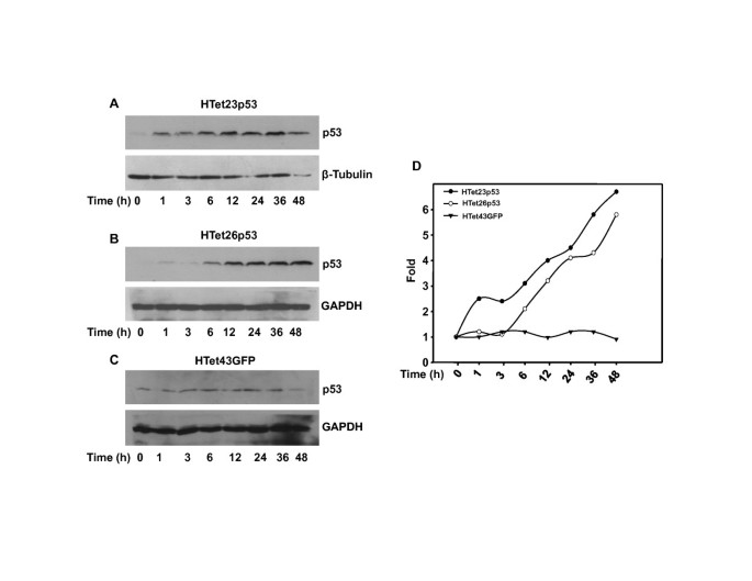 实验目的是建立剂量和时间可控的p53过表达体系,排除外源性p53表达的非特异性干扰。方法是采用DOX诱导的HTet23p53、HTet26p53细胞系(分别过表达p53)和HTet43GFP细胞系(对照),设置不同浓度DOX(0-2000ng/ml)处理48小时,或固定1000ng/ml DOX处理不同时间(1-48小时),通过蛋白质免疫印迹(Western blot)检测p53表达水平。结果显示,DOX以剂量依赖方式诱导p53过表达,2000ng/ml DOX处理后p53表达量升高5倍(n=3,P<0.05);同时以时间依赖方式诱导p53表达,48小时处理后p53表达量升高5倍(n=3,P<0.05),而对照细胞系中p53表达无显著变化。