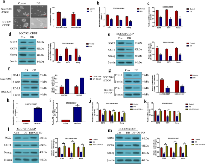 PD-L1作为核心Biomarker,来源为CR-GC细胞及肿瘤组织,通过蛋白质免疫印迹、免疫组化验证其在CR-GC中的高表达(P<0.05),低剂量DB可显著下调其表达(P<0.05);NLRP3作为焦亡通路的关键Biomarker,在CR-GC细胞中低表达,PD-L1负调控其表达(P<0.05),低剂量DB通过下调PD-L1激活NLRP3(P<0.05);CSCs标志物SOX2、OCT4、Nanog在CR-GC细胞中高表达,低剂量DB可显著下调其表达(P<0.05),该作用依赖PD-L1的下调。