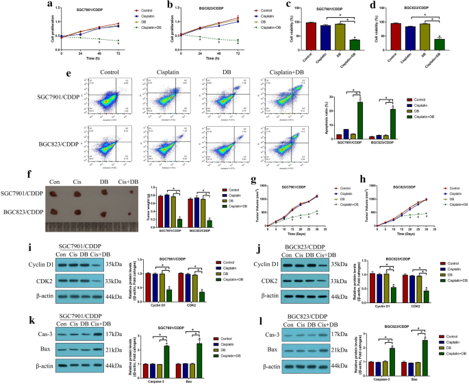 实验目的:建立稳定的CR-GC细胞系及体内异种移植模型,为后续功能与机制研究提供实验基础。方法细节:从Resistant Cancer Cell Line Collection获取CR-GC细胞系(SGC7901/CDDP、BGC823/CDDP),亲本顺铂敏感胃癌(CS-GC)细胞系来自美国典型培养物保藏中心(ATCC);通过逐步递增顺铂浓度(0.5-5μg/ml,持续80天)诱导CS-GC细胞获得获得性顺铂耐药细胞系(ACR-GC);构建BALB/c裸鼠异种移植模型,将2×10^7个CR-GC细胞接种于裸鼠背部皮下,每5天监测肿瘤体积,30天后处死小鼠并称重肿瘤组织。结果解读:CR-GC细胞对顺铂具有显著耐药性,低剂量DB(12.5μM)单药或顺铂单药处理对CR-GC细胞活力无显著影响(P>0.05),而低剂量DB联合顺铂处理可显著抑制CR-GC细胞增殖与活力(P<0.05);体内实验显示,联合处理组肿瘤重量与体积均显著低于单药组(P<0.05),表明低剂量DB可在体内增强顺铂对CR-GC的抗肿瘤作用。