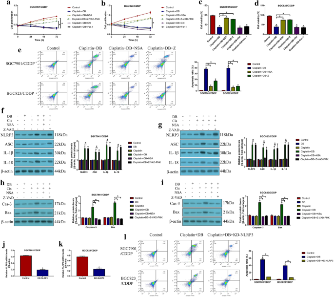 实验目的:明确低剂量DB联合顺铂诱导CR-GC细胞死亡的主要类型及依赖通路。方法细节:分别用凋亡抑制剂(Z-VAD-FMK)、焦亡抑制剂(Necrosulfonamide,NSA)、自噬抑制剂(氯喹)、铁死亡抑制剂(Ferrostatin-1,Fer-1)预处理CR-GC细胞2小时,再用顺铂联合低剂量DB处理48小时;通过CCK-8、台盼蓝染色检测细胞活力,Annexin V-FITC/PI双染流式检测细胞凋亡率,蛋白质免疫印迹(Western Blot)检测焦亡标志物(NLRP3、ASC、IL-1β、IL-18)及凋亡标志物(活化的Caspase-3、Bax)的表达;沉默NLRP3后检测联合处理对细胞死亡的影响。结果解读:仅凋亡抑制剂与焦亡抑制剂可显著逆转联合处理对CR-GC细胞活力的抑制作用(P<0.05),联合处理可显著上调焦亡与凋亡标志物的表达(P<0.05);沉默NLRP3可完全逆转联合处理诱导的细胞死亡(P<0.05),表明低剂量DB联合顺铂通过NLRP3介导的焦亡诱导细胞凋亡,进而增强顺铂的细胞毒性。