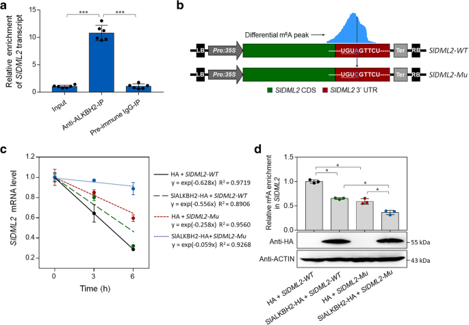 方法细节:采用RNA免疫沉淀(RIP)实验,用SlALKBH2特异性抗体免疫沉淀番茄果实中的RNA-蛋白复合物,通过qRT-PCR检测SlDML2 mRNA的富集水平;构建SlDML2的野生型和m⁶A位点突变型(A→C)的表达载体,与SlALKBH2表达载体共转化本氏烟草叶片,用转录抑制剂放线菌素D处理后,检测SlDML2 mRNA的降解速率;采用m⁶A-IP-qRT-PCR检测SlDML2 mRNA的m⁶A水平。