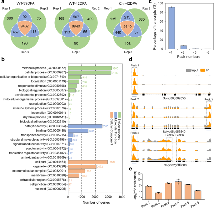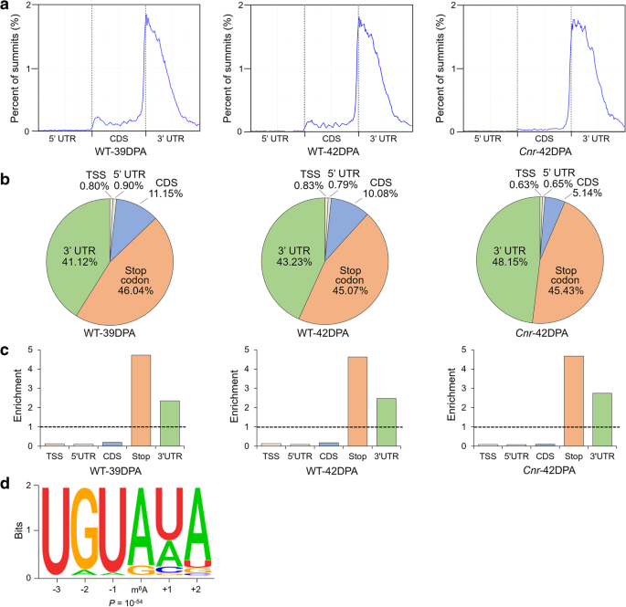 方法细节:对野生型39 DPA、42 DPA和Cnr 42 DPA果实进行m⁶A-seq分析,每个样本3次生物学重复;将mRNA片段化为约100 nt寡核苷酸,用抗m⁶A多克隆抗体进行免疫沉淀,分别构建输入对照和免疫沉淀片段的测序文库,进行高通量测序;采用MACS软件鉴定m⁶A峰(FDR<0.05),仅保留3次重复中均检测到的高置信峰进行后续分析;同时采用m⁶A-免疫沉淀-实时荧光定量PCR(m⁶A-IP-qRT-PCR)验证测序结果。