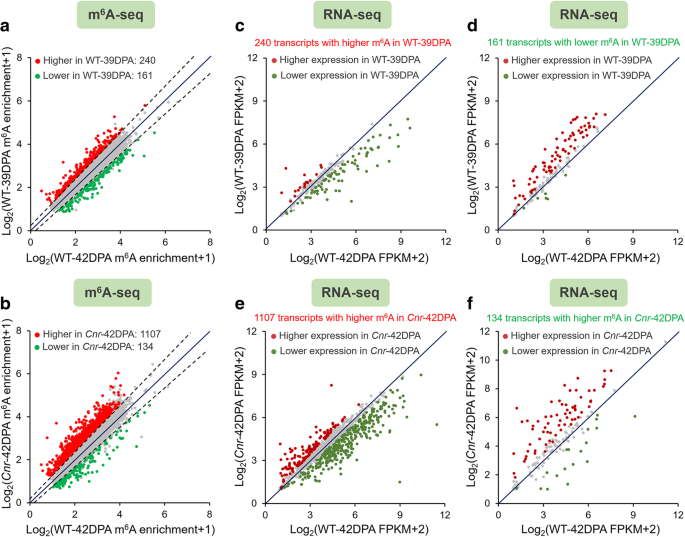 结果解读:番茄果实mRNA中普遍存在m⁶A修饰,约0.5-0.6个m⁶A峰/活跃转录本,与拟南芥和哺乳动物中的水平相当;m⁶A峰主要富集在终止密码子附近和3"非翻译区(3"UTR),序列基序为UGUAYY(Y代表A/G/U/C),与拟南芥中的基序保守;成熟过程中共有401个转录本的m⁶A水平发生显著变化,Cnr突变体与野生型相比有1241个转录本的m⁶A水平显著变化,其中1107个转录本的m⁶A水平升高,仅134个降低,呈现全基因组m⁶A水平升高的特征;进一步分析显示m⁶A修饰水平与转录本丰度呈负相关,即m⁶A水平升高的转录本其表达量通常降低。