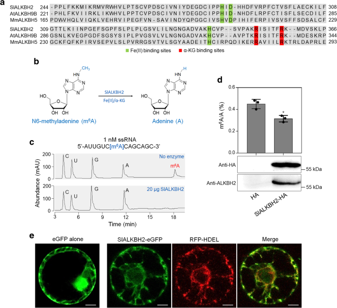 方法细节:构建SlALKBH2的原核表达载体,在大肠杆菌BL21(DE3)中表达重组His标签蛋白,纯化后与m⁶A修饰的ssRNA底物孵育,采用高效液相色谱(HPLC)检测去甲基化效果;构建SlALKBH2-HA融合蛋白载体,瞬时转化本氏烟草叶片,采用LC-MS/MS检测叶片中总mRNA的m⁶A水平;构建SlALKBH2-eGFP融合蛋白载体,与内质网(ER)标记RFP-HDEL共转化本氏烟草叶片,分离原生质体后用共聚焦显微镜观察荧光信号。