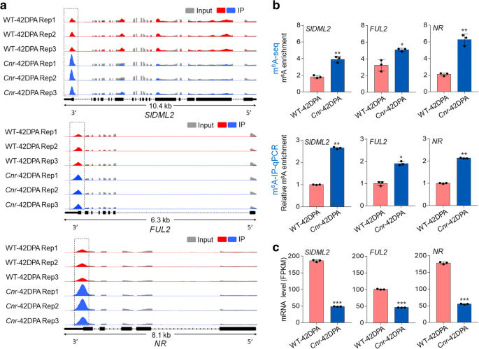结果解读:SlDML2、FUL2、NR的mRNA在Cnr突变体中的m⁶A富集水平显著高于野生型(n=3,P<0.05),而其转录本丰度显著低于野生型(n=3,P<0.01),进一步验证了m⁶A修饰与转录本丰度的负相关关系,提示这些成熟关键基因的表达可能受m⁶A修饰的转录后调控。