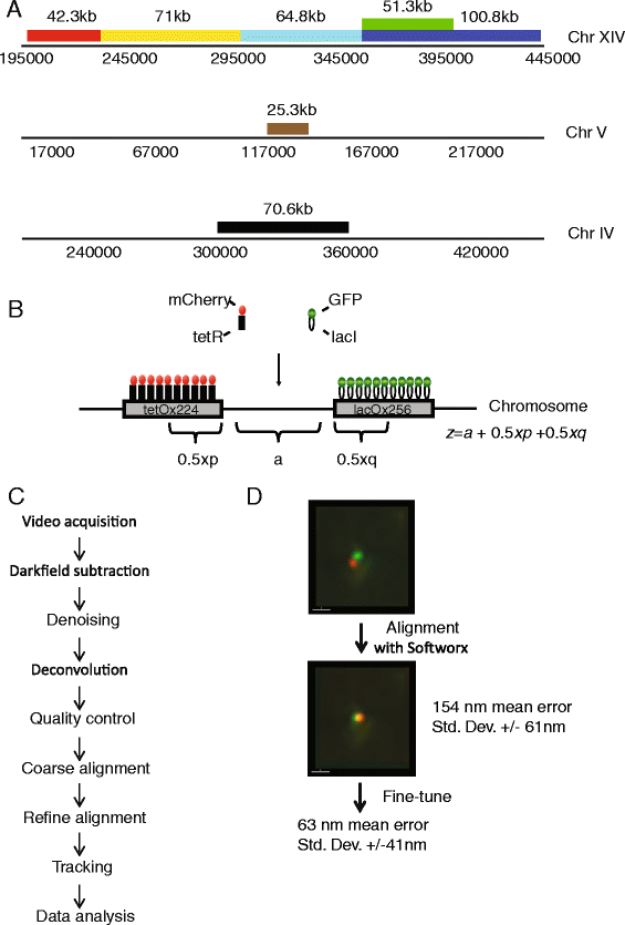 实验目的是构建可实时追踪染色质构象的活细胞模型,并建立精度足够的成像分析流程,以准确测量染色质位点的3D位置。方法细节上,研究人员构建了7株酿酒酵母菌株,在不同长度的基因组区间两侧分别整合256个lac操纵子阵列和224个tet操纵子阵列,通过GFP标记的LacI蛋白和mCherry标记的TetR蛋白特异性结合操纵子,实现对目标染色质位点的荧光标记;采用GE|OMX Blaze®显微镜进行活细胞3D成像,成像流程包含暗场减噪、ND-SAFIR算法去噪、Softworx软件去卷积等步骤,并通过两步通道对齐策略——首先利用多波长荧光珠子进行粗对齐,再通过表达共定位荧光标记的对照菌株进行细对齐——将位点距离测量误差从110nm降至63nm。结果解读显示,成功建立的成像系统可实现活细胞中染色质位点的3D追踪,63nm的测量精度足以捕捉染色质构象的细微变化。产品关联:文献未提及具体实验产品,领域常规使用荧光蛋白标记的转录抑制因子、高分辨率活细胞结构光照明显微镜及专业图像去噪与分析软件。