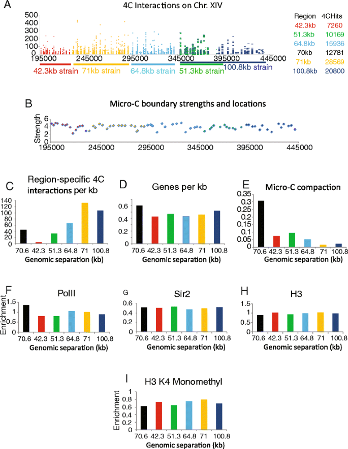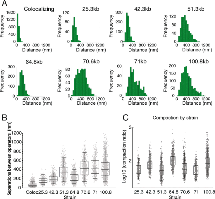 实验目的是解析不同基因组区间的染色质压缩特性,并探索调控染色质压缩的潜在因素。方法细节上,研究人员对7株菌株在细胞周期G1期的荧光位点物理距离进行测量,计算染色质压缩比(基因组长度与物理距离的比值);同时结合已发表的Hi-C、Micro-C染色体相互作用数据,以及18种染色质特征(组蛋白修饰、转录因子结合、组蛋白 occupancy等)的ChIP-seq数据,分析这些因素与染色质压缩状态的相关性。结果解读显示,染色质位点的物理距离随基因组长度增加呈非线性增长,其中42kb、64kb、100kb基因组区间的染色质压缩比显著高于其他区间;但Hi-C/Micro-C检测的染色体相互作用频率、组蛋白修饰水平、转录因子结合丰度等已知染色质特征,与染色质压缩状态无显著相关性,提示存在尚未鉴定的调控因素影响染色质构象。