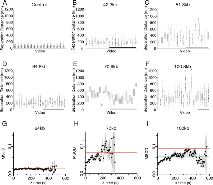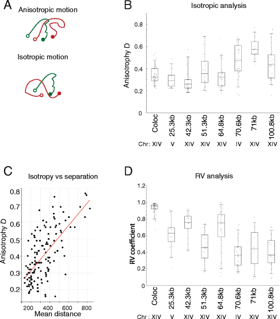 实验目的是研究单个细胞内染色质构象的时间动态变化,以及细胞间染色质构象的异质性特征。方法细节上,研究人员对每个菌株采集了多段包含50-100个时间点的活细胞成像视频,计算荧光位点距离的均方变化(MSCD)以分析构象变化的时间尺度;通过各向异性统计量D评估位点运动的约束程度,利用RV系数分析两个标记位点的运动相关性。结果解读显示,单个细胞内的染色质位点距离随时间持续波动,细胞间的平均位点距离差异可达2-4倍,且这种异质性可在细胞中维持1-10分钟;MSCD曲线在30-150秒后进入平台期,表明染色质构象的变化在该时间尺度后趋于稳定;当基因组分离长度超过70kb时,位点运动的各向异性显著增加,运动相关性降低,提示细胞核环境对远距离染色质位点的运动约束更强。