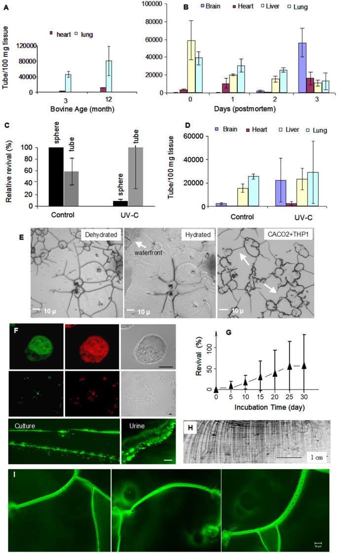结果解读:心脏、肺脏组织中稻草细胞数量随动物年龄增长而增加(文献未明确样本量,基于图表趋势推测);UV-C辐射(10分钟)可导致90%正常细胞死亡,但不影响稻草细胞的复水存活及形态恢复;复水后的稻草细胞在10-15天内恢复球形形态并开始分裂;丝状网络可快速吸收水分,不同细胞系来源的稻草细胞可形成互联网络。