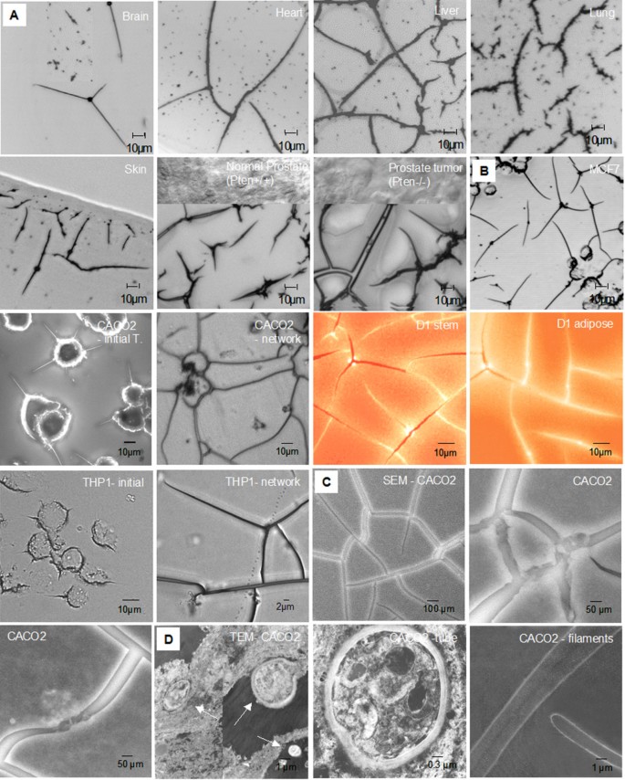 方法细节:采集新鲜/冷冻的牛脑、心脏、肝脏、肺脏、皮肤组织,以及小鼠正常和肿瘤前列腺组织,通过组织冲洗液离心后镜检观察天然稻草细胞;选取人肿瘤细胞系(THP1、CACO2、MCF7)及小鼠干细胞系(D1、脂肪D1)进行开放环境脱水处理,时长5-8小时,采用光学显微镜、扫描电子显微镜(SEM)、透射电子显微镜(TEM)观察细胞形态变化。