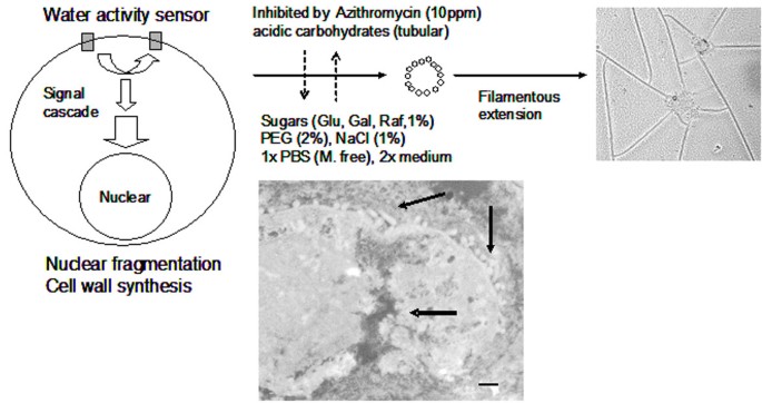 结果解读:脱水细胞的14C葡萄糖掺入量显著高于正常细胞(文献未明确具体数值,基于实验描述推测),表明转化过程中代谢活性增强;热力学分析显示管状结构的自由能远高于球形细胞,自发聚合形成管状结构的概率极低;阿奇霉素可抑制稻草细胞转化,提示转化过程涉及蛋白激酶介导的信号通路。