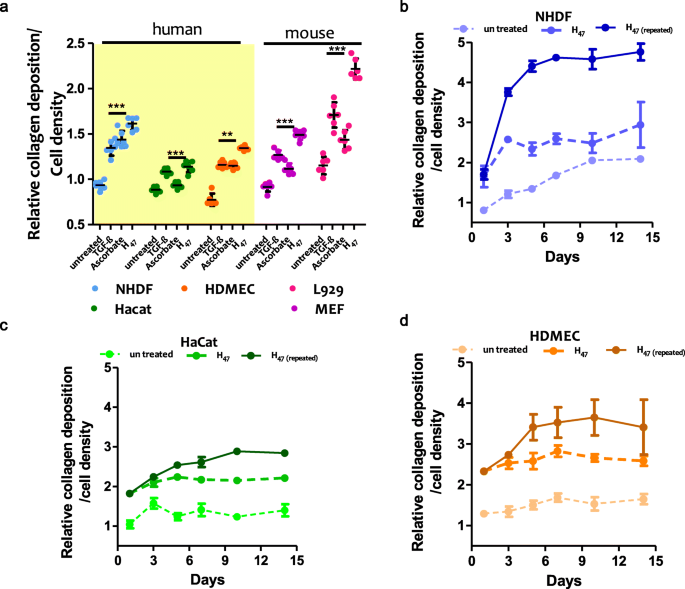 实验目的:对比外源性Hsp47与现有胶原诱导剂的促沉积效果,明确时间依赖性与重复给药的影响。方法细节:将不同皮肤细胞接种于培养板24h后,分别用0.5μM H47、TGF-β1或抗坏血酸处理3h,换液后继续培养24h或1-14天;重复给药组在培养第1、3、6、9、12天添加0.5μM H47;采用天狼星红(Sirius Red)染色法定量胶原沉积,以未处理的NHDF细胞为对照进行归一化分析。结果解读:H47处理后,NHDF的胶原沉积量增加70%,HaCaT增加20%,HDMEC增加50%,小鼠成纤维细胞(L929、MEF)增加70-100%,其促沉积效果比TGF-β1与抗坏血酸高20-50%(n=6,P<0.001);时间效应分析显示,未处理细胞的胶原沉积在培养前6天逐渐增加,细胞汇合后进入平台期;重复给药H47可使成纤维细胞的胶原沉积在培养第5天达到2-3倍的提升,而细胞汇合后给药则无明显促沉积效果,证实细胞增殖状态是Hsp47发挥作用的关键前提。