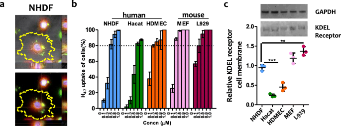 实验目的:验证不同皮肤细胞类型对外源性Hsp47的摄取效率、细胞内定位,明确摄取过程与KDEL受体的关联。方法细节:采用EGFP标记的重组Hsp47(H47)处理人真皮成纤维细胞(NHDF)、表皮角质形成细胞(HaCaT)、真皮内皮细胞(HDMEC)及小鼠成纤维细胞(L929、MEF),设置0.1μM至1.0μM的浓度梯度,孵育3h后,使用内质网追踪染料(ER tracker)进行细胞染色,通过共聚焦显微镜观察H47的细胞内定位;同时提取细胞膜蛋白组分,采用免疫印迹(Western blot)检测KDEL受体的表达水平,以胞浆GAPDH作为细胞内参。结果解读:H47的摄取具有浓度依赖性与细胞类型依赖性,NHDF、L929及MEF在0.5μM浓度下的摄取率超过80%,HDMEC在0.5μM时摄取率达80%,而HaCaT需在0.8μM以上浓度才能达到约80%的摄取率;共聚焦成像显示H47与内质网信号共定位,证实其被转运至内质网发挥功能;Western blot结果显示,细胞膜上KDEL受体的表达水平与H47的摄取率呈正相关(n=3,P<0.001),验证了Hsp47通过KDEL受体介导的内吞作用进入细胞的机制。