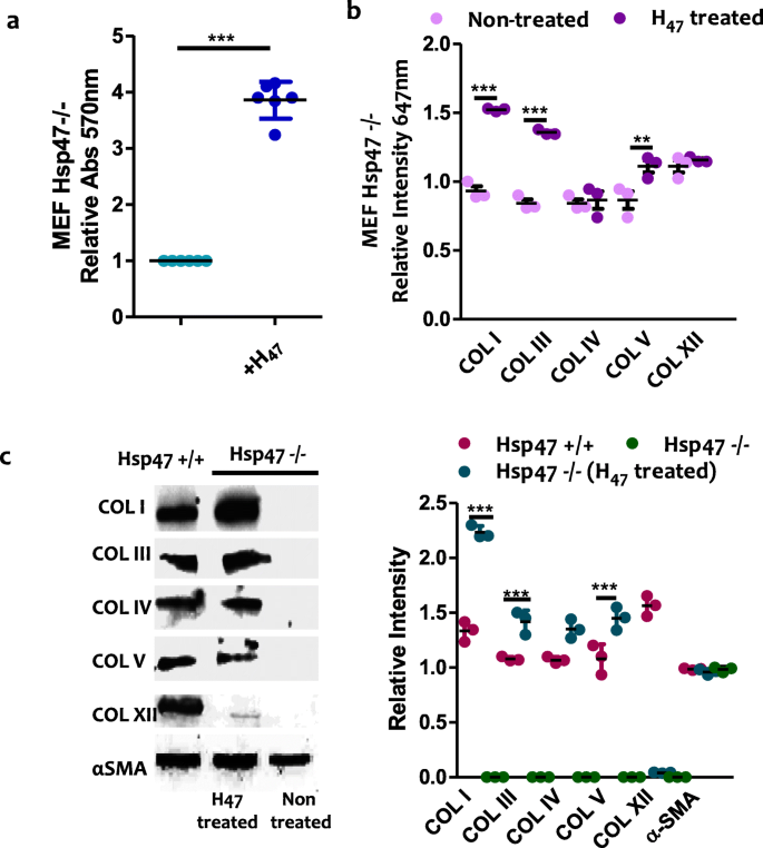 实验目的:明确外源性Hsp47对不同胶原亚型(I、III、IV、V、XII)的调控特异性,验证其在Hsp47缺陷细胞中的功能。方法细节:细胞经H47处理后,采用去细胞化方法保留细胞外基质,使用胶原亚型特异性抗体进行免疫荧光染色,通过荧光定量分析不同亚型的沉积水平;同时在Hsp47基因敲除的MEF细胞(Hsp47-/-)中进行验证,采用Western blot检测胶原亚型的表达变化。结果解读:所有细胞类型中,纤维状胶原I、III、V的沉积均显著上调,其中成纤维细胞中的上调幅度显著高于HaCaT与HDMEC(n=3,P<0.001);HaCaT与HDMEC中网络状胶原IV的沉积明显增强,而纤维相关胶原XII的沉积无显著变化;在Hsp47-/-细胞中,H47处理可使胶原I、III、V的沉积恢复至野生型MEF细胞的水平,而IV与XII型胶原无明显变化,证实Hsp47特异性调控纤维状胶原的合成与沉积。