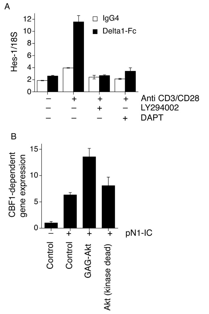 实验目的:验证PI3K-Akt通路在生理状态下的原代T细胞中对Notch反应性的调控作用。方法细节:从健康供者外周血中分离纯化CD4+T细胞,采用抗CD3/CD28抗体激活T细胞受体(TCR)通路,Delta1-Fc激活Notch通路;分别用LY294002、γ分泌酶抑制剂DAPT处理细胞,通过实时定量聚合酶链反应(qRT-PCR)检测Notch靶基因Hes-1的表达;同时采用核转染技术过表达组成型激活的Akt(gagAkt)或Notch1胞内域(N1-IC),检测CBF1报告基因活性。结果解读:在无外源性Delta1刺激时,TCR激活可上调Hes-1表达,且该效应可被LY294002和DAPT完全抑制;Delta1-Fc单独处理仅诱导Hes-1轻度上调,而与TCR激活协同处理时,Hes-1表达显著升高,且依赖PI3K通路(LY294002可抑制);过表达gagAkt可显著增强N1-IC驱动的CBF1报告基因活性,说明PI3K-Akt通路可增强原代CD4+T细胞的Notch反应性。产品关联:文献未提及具体实验产品,领域常规使用磁珠分离CD4+T细胞、qRT-PCR检测试剂盒类试剂。