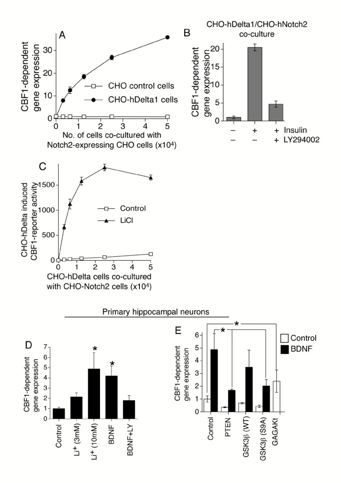 实验目的:验证PI3K-Akt-GSK3β轴调控Notch反应性的细胞类型普遍性。方法细节:采用稳定表达Notch2和CBF1报告基因的CHO-N2细胞,与表达Delta1的CHO-hDelta1细胞共培养,加入胰岛素激活PI3K通路或LY294002处理,检测报告基因活性;在原代大鼠海马神经元中,用脑源性神经营养因子(BDNF)激活PI3K通路,LiCl处理抑制GSK3β,转染Pten、gagAkt或组成型激活的GSK3β(S9A,不被Akt磷酸化抑制),检测N1-IC驱动的CBF1报告基因活性。结果解读:胰岛素处理可显著增强CHO细胞中Notch信号,LY294002可完全阻断该效应;LiCl处理可剂量依赖性增强神经元中Notch信号,BDNF处理可增强N1-IC驱动的报告基因活性,LY294002和Pten转染可阻断该效应;过表达gagAkt可增强神经元中Notch信号,而S9A GSK3β过表达可阻断BDNF对Notch信号的增强作用,说明PI3K-Akt-GSK3β轴对Notch反应性的调控在多种细胞类型中保守。产品关联:文献未提及具体实验产品,领域常规使用细胞共培养体系、神经细胞培养试剂类试剂。