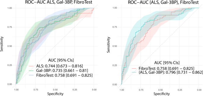 实验目的是构建基于ALS和Gal-3BP的组合诊断模型,并与现有非侵入性肝纤维化评估方法比较诊断性能。方法细节为采用逻辑回归模型将ALS和Gal-3BP的血浆浓度进行组合,在Angers验证队列中计算组合模型的AUROC;同时,将单标志物、组合模型的AUROC与现有常用方法(如FibroTest、FIB-4、NFS、FibroQ等)进行比较。结果解读显示,ALS与Gal-3BP的组合模型区分早期与晚期肝纤维化的AUROC为0.796(95%CI 0.731-0.862),显著高于单标志物的诊断性能,且优于FibroTest(AUROC=0.758)、FIB-4、NFS等多数现有方法,仅略低于Fibroscan。这一结果表明,组合模型的诊断性能更优,可为临床提供更准确的肝纤维化分期信息。