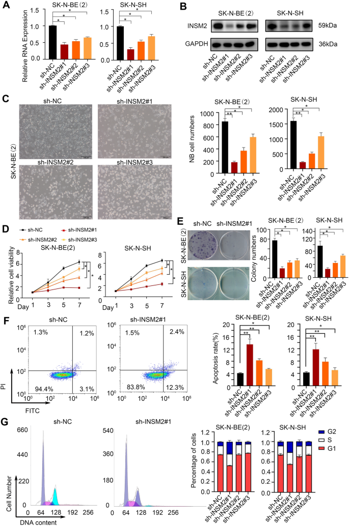 方法细节:构建INSM2的短发夹RNA(shRNA)载体,感染SK-N-BE(2)和SK-N-SH细胞,通过qRT-PCR和蛋白质免疫印迹验证敲减效率;通过显微镜观察、CCK-8实验、克隆形成实验检测细胞增殖能力,流式细胞术检测细胞凋亡和周期分布;构建INSM2过表达载体,回补敲减INSM2的细胞,验证细胞增殖能力的恢复;建立裸鼠皮下异种移植模型,注射敲减INSM2的SK-N-BE(2)细胞,观察肿瘤生长情况,通过蛋白质免疫印迹和免疫组化(IHC)验证肿瘤组织中INSM2的敲减效率及细胞增殖、凋亡情况。