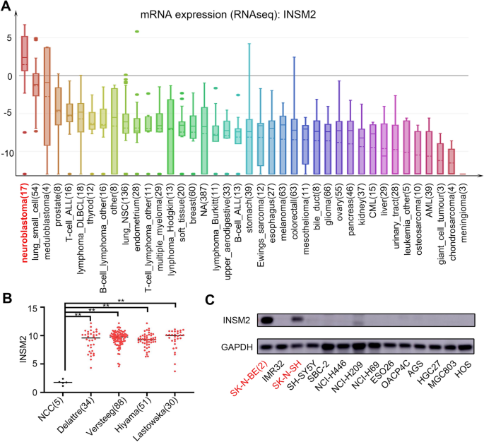 结果解读:CCLE数据库分析显示神经母细胞瘤细胞系的INSM2表达水平显著高于其他肿瘤细胞系;临床样本分析显示,神经母细胞瘤中INSM2的mRNA表达显著高于正常神经嵴细胞(n=5 vs n=34/88/51/30,P<0.01),且显著高于节细胞神经瘤样本(文献未明确样本量,P<0.05);蛋白质免疫印迹结果显示INSM2蛋白特异性表达于神经母细胞瘤细胞系中。