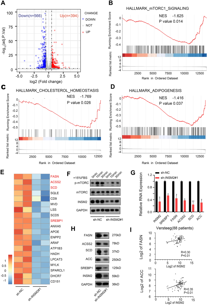 结果解读:RNA-seq分析显示,敲减INSM2后有566个基因下调、394个基因上调(log2 Fold Change≥0.5,P<0.05);GSEA分析显示差异基因富集于mTOR信号通路抑制、胆固醇稳态和脂肪生成通路;蛋白质免疫印迹显示敲减INSM2后mTOR的磷酸化水平显著降低(n=3,P<0.01),脂质代谢相关基因SREBP1、FASN、ACC等的表达显著下调(n=3,P<0.01);免疫荧光和流式细胞术显示敲减INSM2后细胞内脂滴含量显著降低(n=3,P<0.01);脂质组学分析显示,敲减INSM2后细胞内120种脂质离子显著减少,包括卵磷脂和鞘磷脂代谢相关的多种脂质(n=6,P<0.05);整合组学数据显示INSM2通过调控mTOR-SREBP1轴影响脂质代谢。