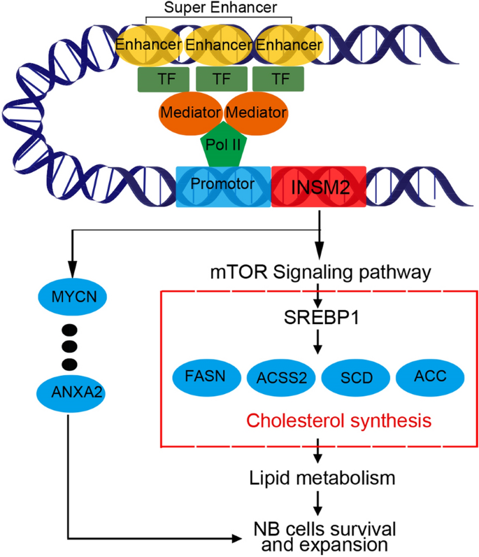 现有研究显示,神经母细胞瘤的异质性可部分由MYCN扩增、ALK突变等分子异常解释,这些基因组变异维持了肿瘤细胞的生物学特性,但针对这些靶点的治疗手段仍有限。超级增强子作为细胞身份的关键调控元件,在神经母细胞瘤中富集于多个癌基因区域,调控HAND2等细胞身份基因的表达,为肿瘤治疗提供了新的潜在靶点,但目前对超级增强子调控的下游功能基因的研究仍不全面。脂质代谢异常在多种肿瘤中被证实可促进细胞增殖和肿瘤进展,神经母细胞瘤中脂肪酸合成相关基因的高表达与不良预后相关,干扰脂肪酸合成可诱导肿瘤细胞分化并降低存活能力,但神经母细胞瘤中脂质代谢的上游调控网络仍未被充分解析,缺乏关键调控因子的鉴定。本研究的创新点在于首次发现超级增强子关联基因INSM2在神经母细胞瘤中高表达,并通过体内外实验及组学分析,揭示其通过mTOR-SREBP1轴调控脂质代谢进而促进肿瘤进展的分子机制,填补了神经母细胞瘤脂质代谢上游调控因子的研究空白,为该领域提供了新的治疗靶点。